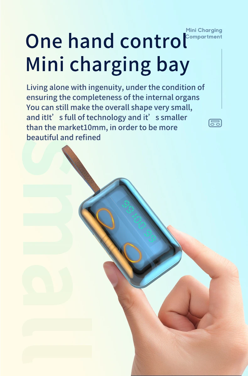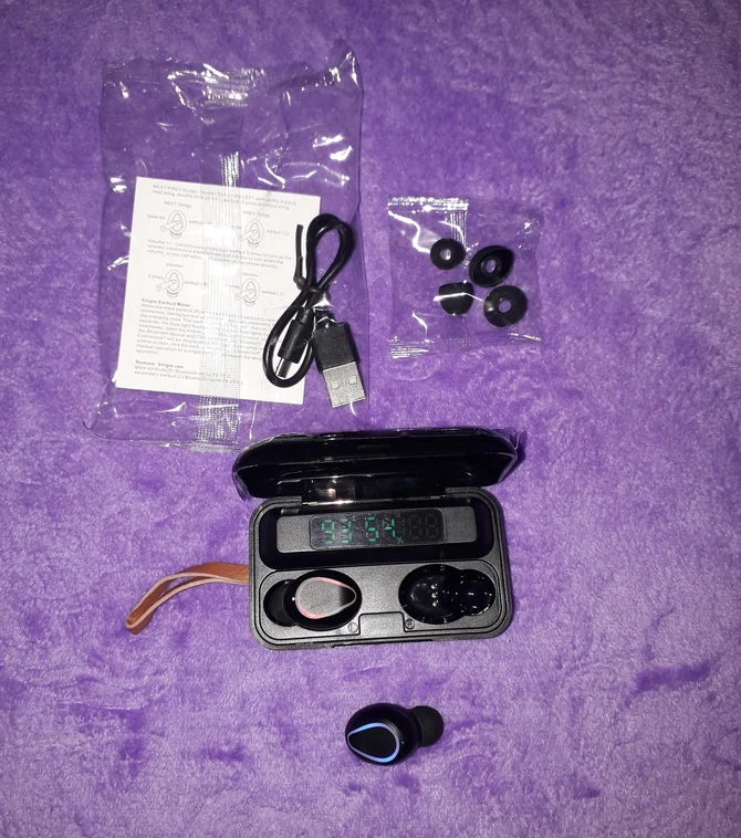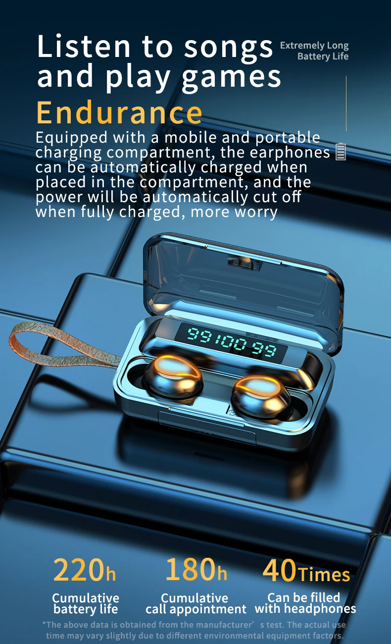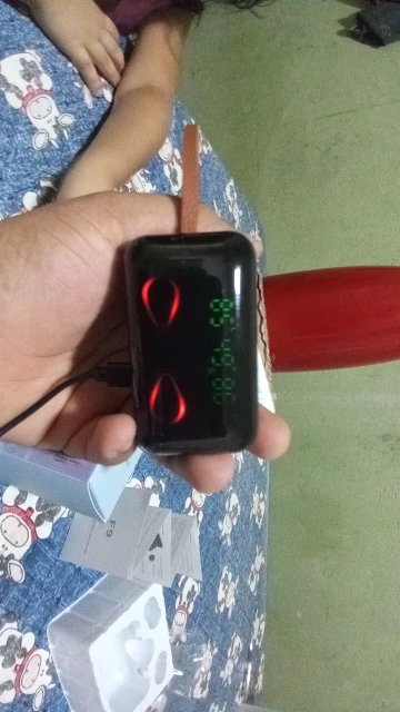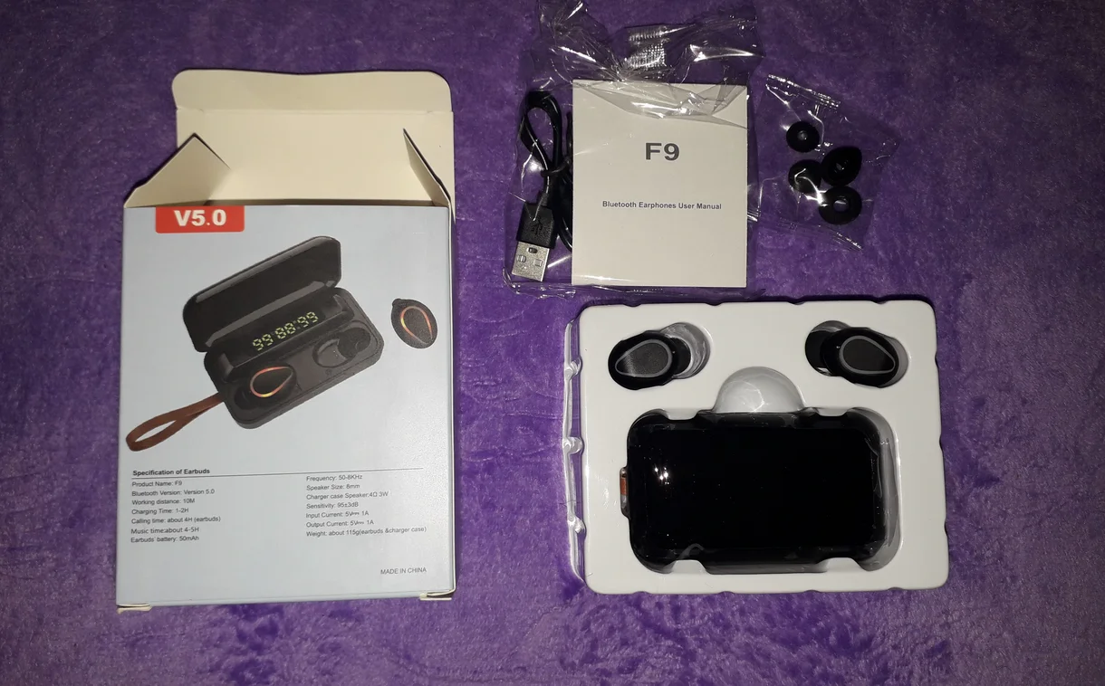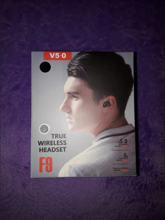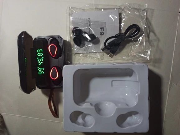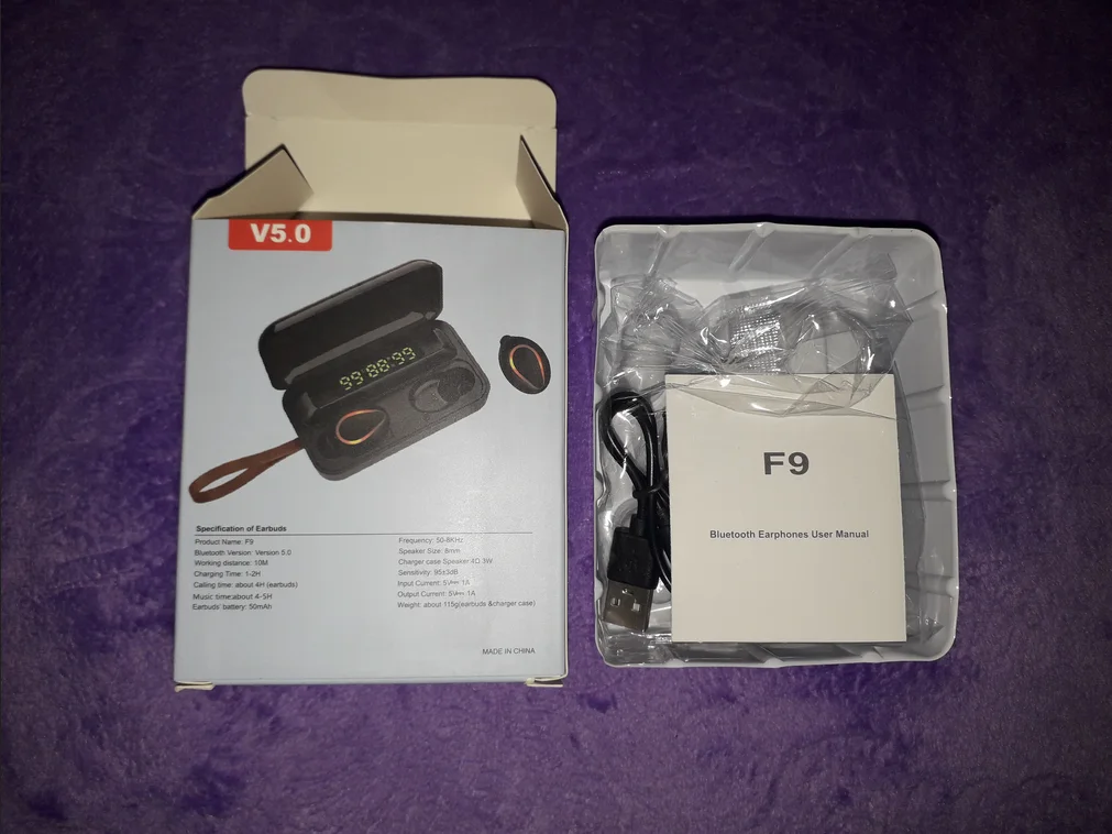 사양 이어폰 1. 제품 이름: F9 2. 블루투스 버전: 버전 5.0 3. 프로토콜: 지원 HFP 1.7, HSP 1.2, A2DP 1 AVRCP 1.6, SPP 1.2 및 PBAP 1.0 4. 칩셋: BT8832A 5. 작동 거리: 10M 6. 통화 시간: 4-5H (1 시간 완전 충전) 7. 음악 시간 재생: 4-5H (1 시간 완전 충전) 8. 대기 시간: 650H (충전기 케이스 포함) 9. 주파수: 2402MHz ~ 2480MHz 10. 배터리 유형: 3.7V, >50mA 리튬 배터리 11. 위탁 시간: 1-2H 12. 작동 온도: -10 °-55 ° 충전기 케이스의 명세: 1. 입력 현재: 5v — 1a 2. 출력 전류: 5v — 1a 3. 위탁 시간: 1-2H 4. 충전기 케이스 스피커: 4Ω 3W