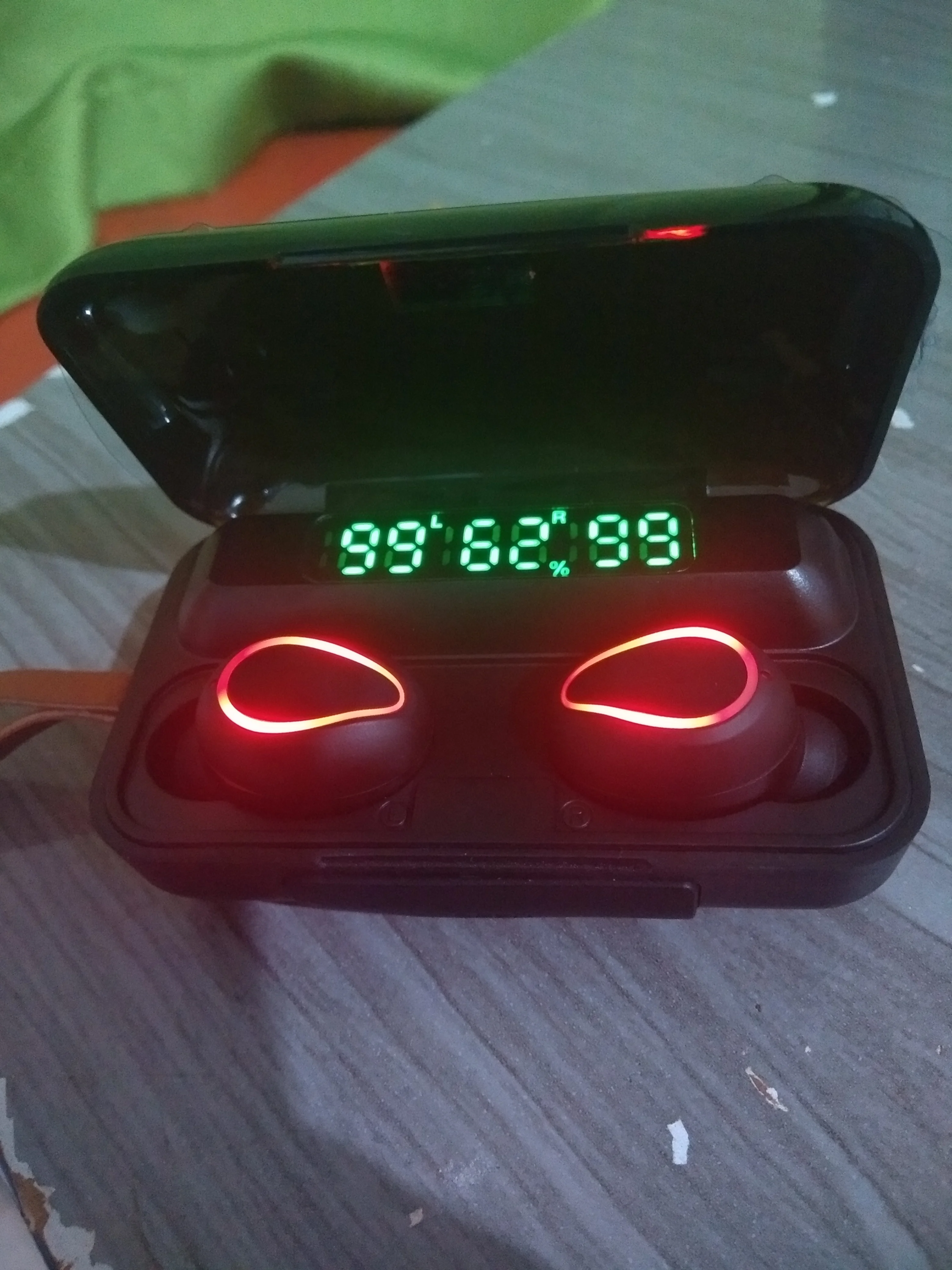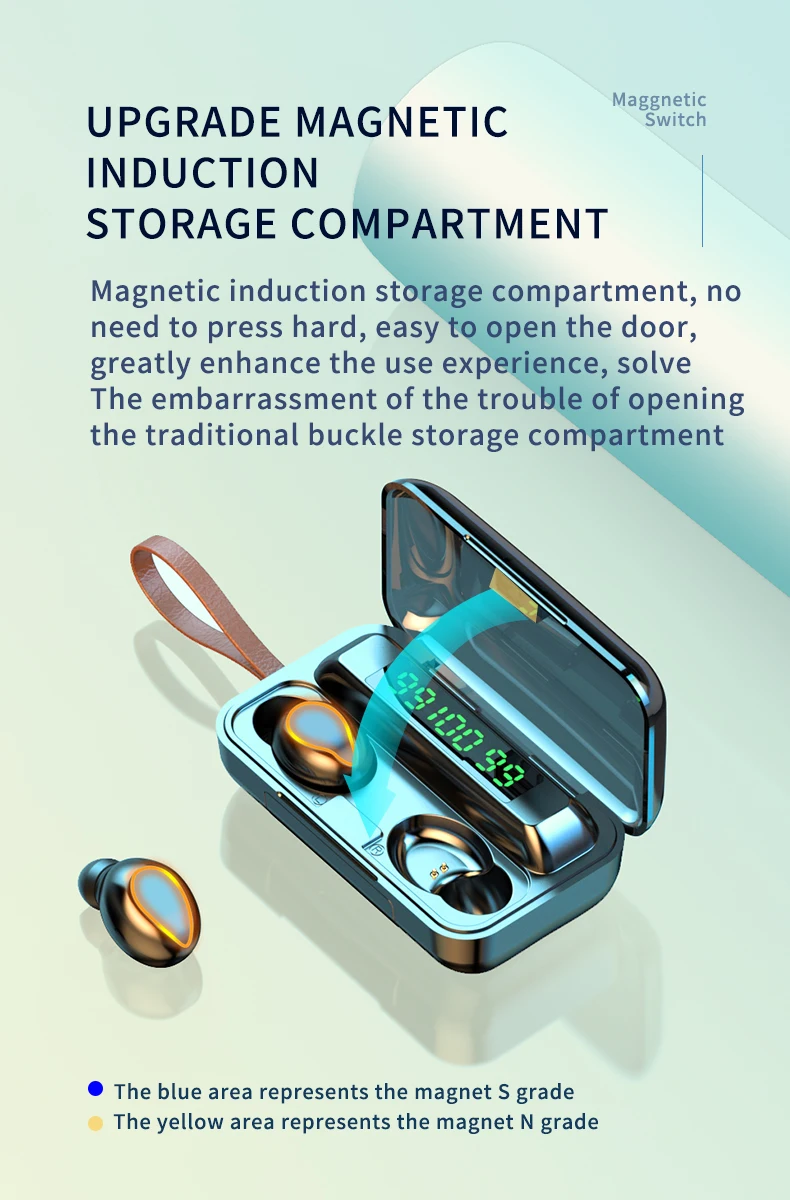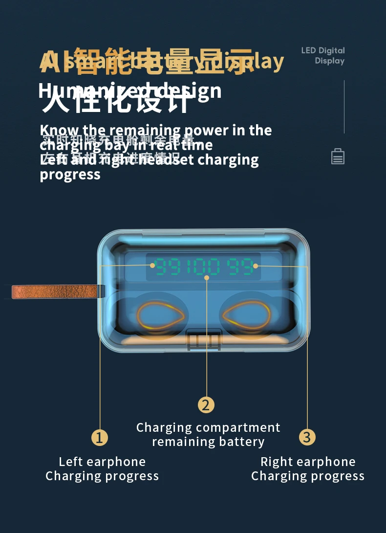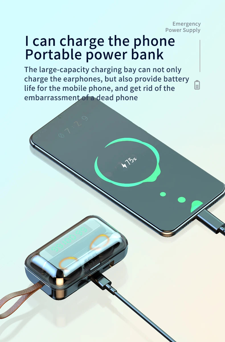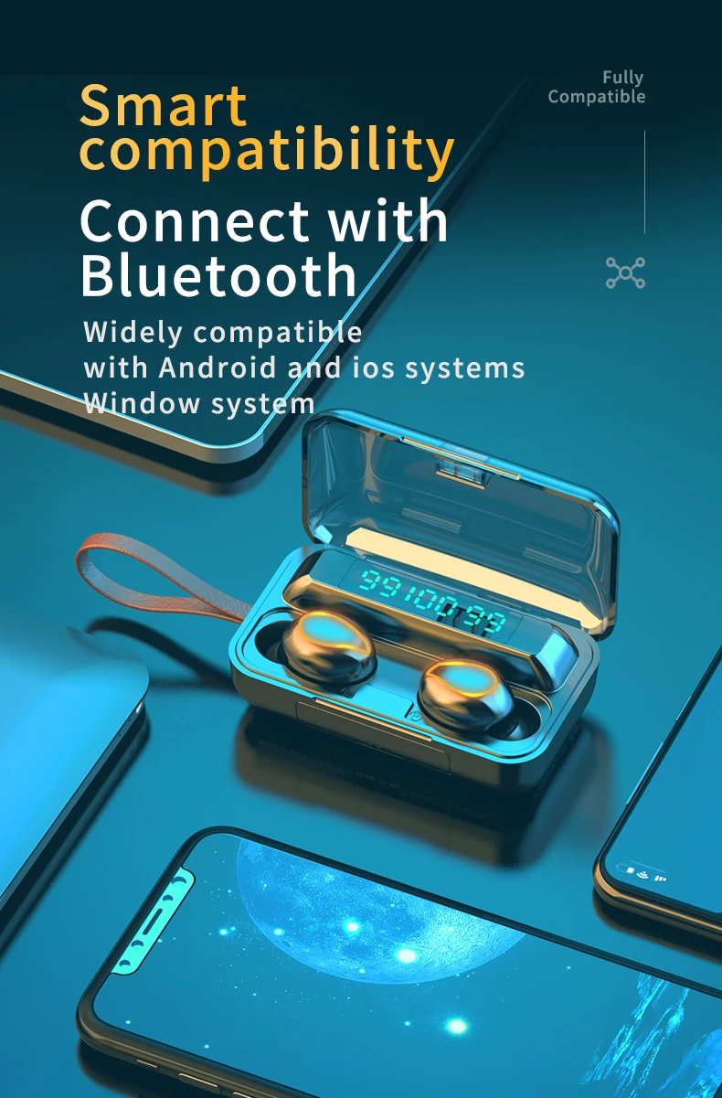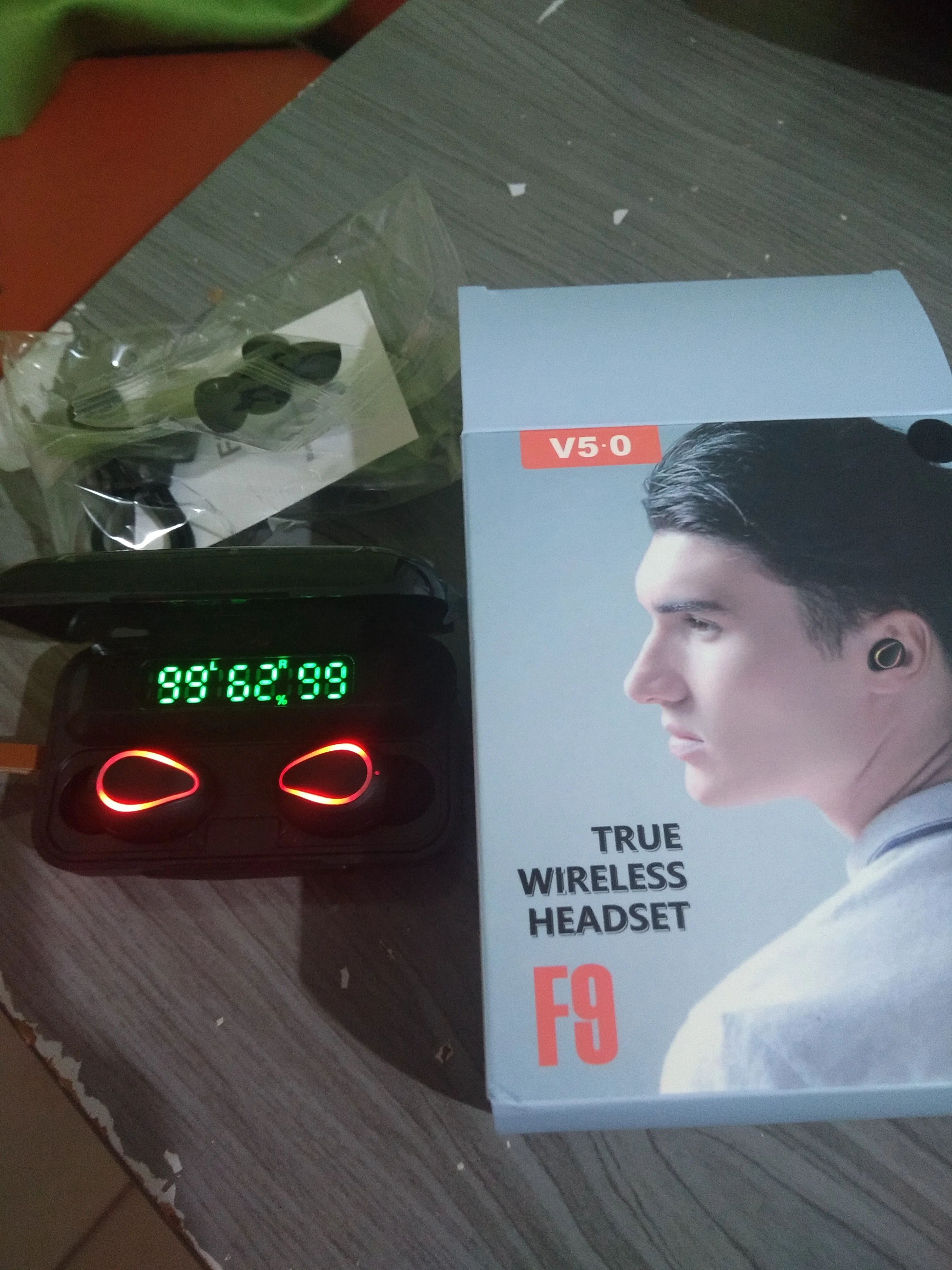 사양 이어폰 1. 제품 이름: F9 2. 블루투스 버전: 버전 5.0 3. 프로토콜: 지원 HFP 1.7, HSP 1.2, A2DP 1 AVRCP 1.6, SPP 1.2 및 PBAP 1.0 4. 칩셋: BT8832A 5. 작동 거리: 10M 6. 통화 시간: 4-5H (1 시간 완전 충전) 7. 음악 시간 재생: 4-5H (1 시간 완전 충전) 8. 대기 시간: 650H (충전기 케이스 포함) 9. 주파수: 2402MHz ~ 2480MHz 10. 배터리 유형: 3.7V, >50mA 리튬 배터리 11. 위탁 시간: 1-2H 12. 작동 온도: -10 °-55 ° 충전기 케이스의 명세: 1. 입력 현재: 5v — 1a 2. 출력 전류: 5v — 1a 3. 위탁 시간: 1-2H 4. 충전기 케이스 스피커: 4Ω 3W